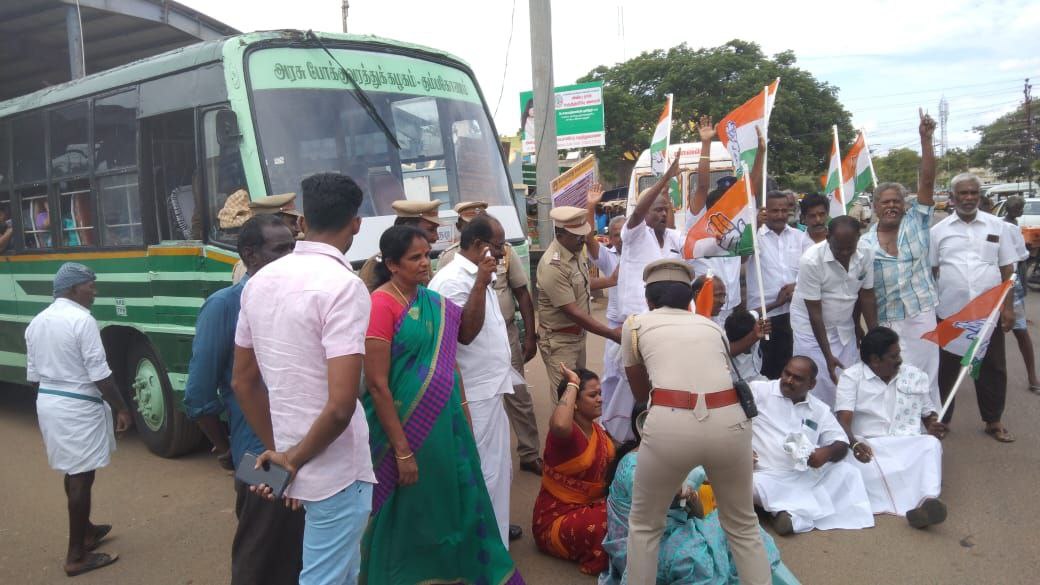 இதனால் கொதித்தெழுந்த காங்கிரஸ் பேரியக்க தொண்டர்கள் இதனை எதிர்க்கும் விதமாக அகில இந்திய அளவில் ஆர்ப்பாட்டம் மற்றும் போராட்டங்களை முன்னெடுத்து வருகின்ற நிலையில், சிவகங்கை மாவட்ட காங்கிரஸ் கட்சி சார்பில் சிவகங்கை பேருந்து நிலையம் முன்பாக பேருந்து மறியல் போராட்டத்தில் ஈடுபட்ட பேருந்து வழித்தடத்தில் கட்சி கொடி ஏந்தியவாறு எதிர்ப்பு கோஷங்களோடு அமர்ந்தனர், அதனைத் தொடர்ந்து ஆர்ப்பாட்டமும் நடைபெற்றது. போலீசார் முன்னெச்சரிக்கையாக அவர்களை தடுத்து நிறுத்தி போக்குவரத்தை சீர்செய்தனர்.