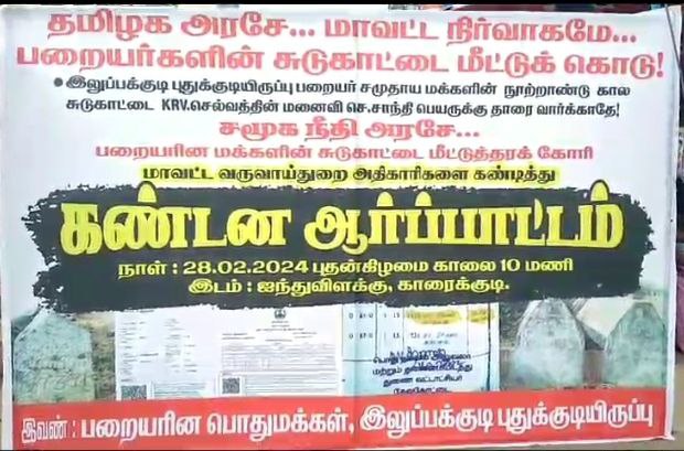 இடத்தை முறைகேடாக செல்வம் மனைவி சாந்தி பெயருக்கு வழங்கப்பட்ட பட்டா எண்: 114-4 ஐ ரத்து செய்து மயானத்தை மீட்டு தரக்கோரி இலுப்பைக்குடி கிராமம் பட்டியல் பறையர் இன பொதுமக்கள் சார்பாக காரைக்குடி ஐந்து விளக்கு பகுதியில் கண்டன ஆர்ப்பாட்டம் நடந்தது. ஆர்ப்பாட்டத்தில் கிராமத்தினர் மற்றும் பொதுமக்கள் கலந்து கொண்டனர்.